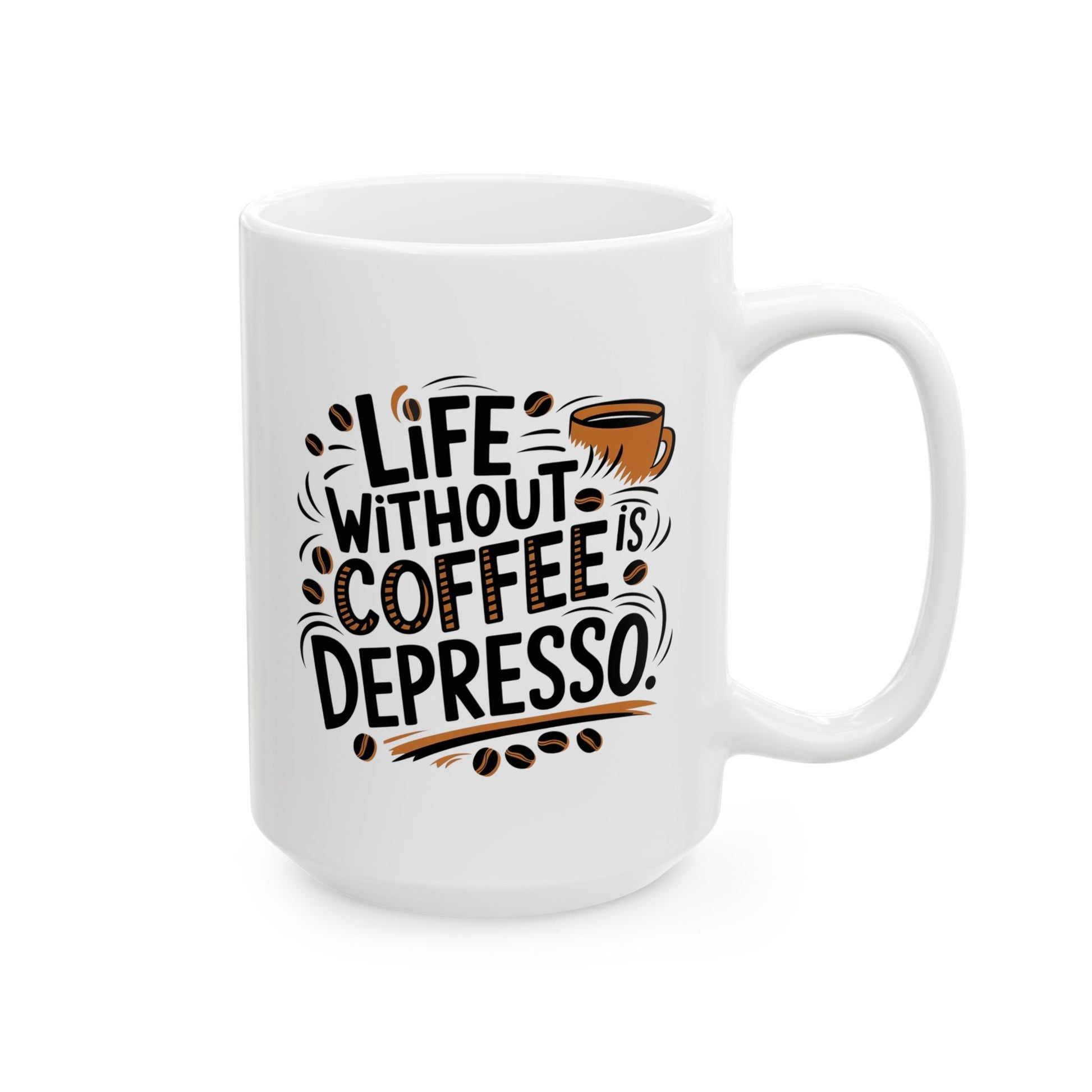 Enjoy your favorite brew with fun ceramic mug, designed for those who appreciate a clever twist on words, "Life Without Coffee is Depresso." This durable, comfortable mug adds a touch of humor to your daily coffee ritual, making every sip more enjoyable. Perfect for gifting or personal use, it’s a charming way to celebrate your love for coffee while brightening your day.