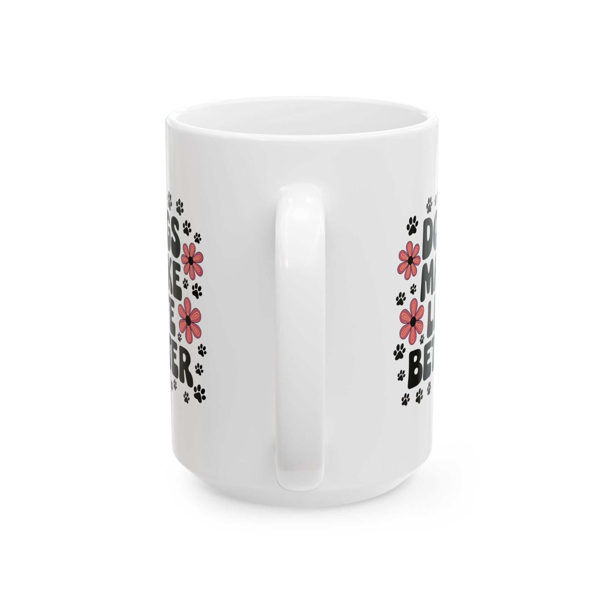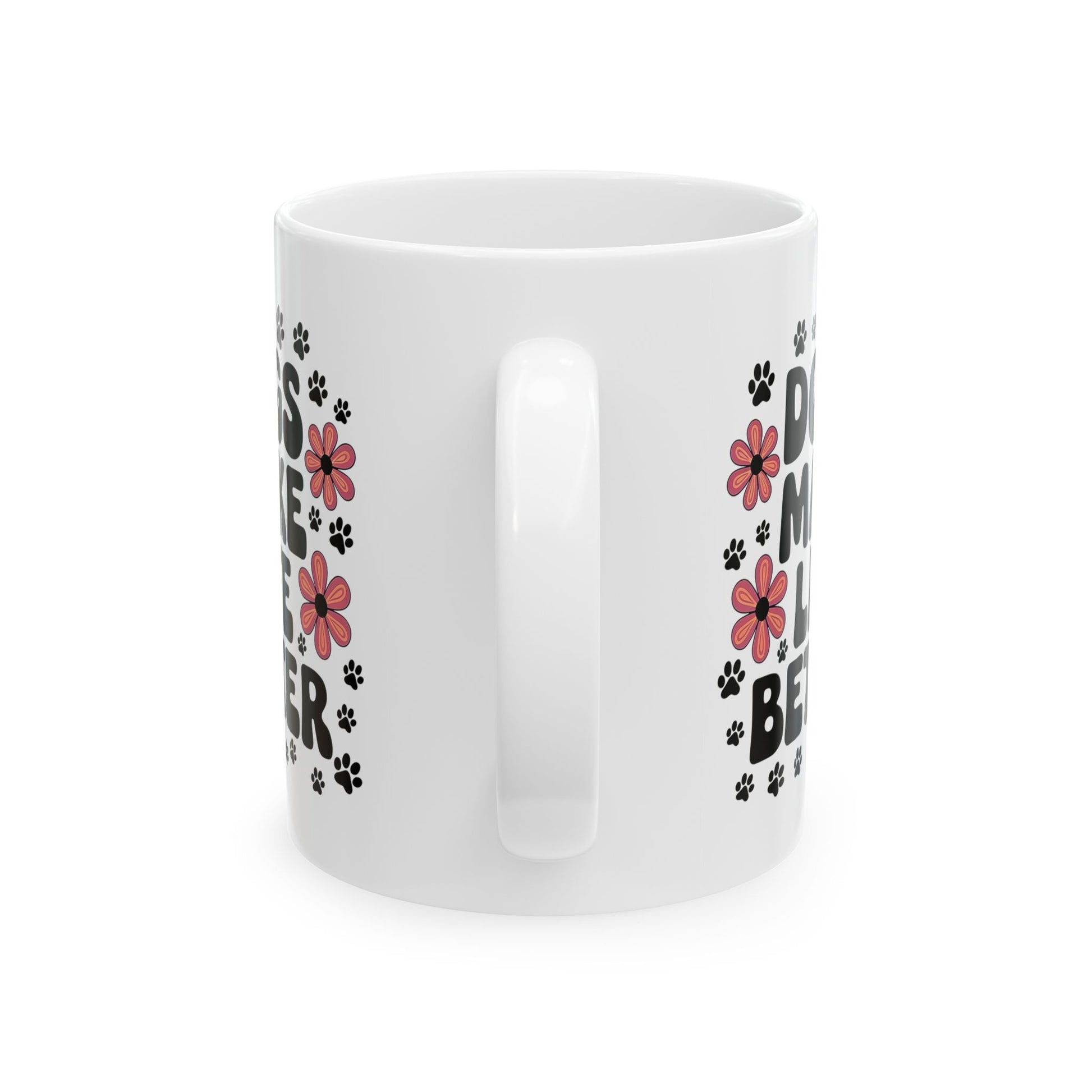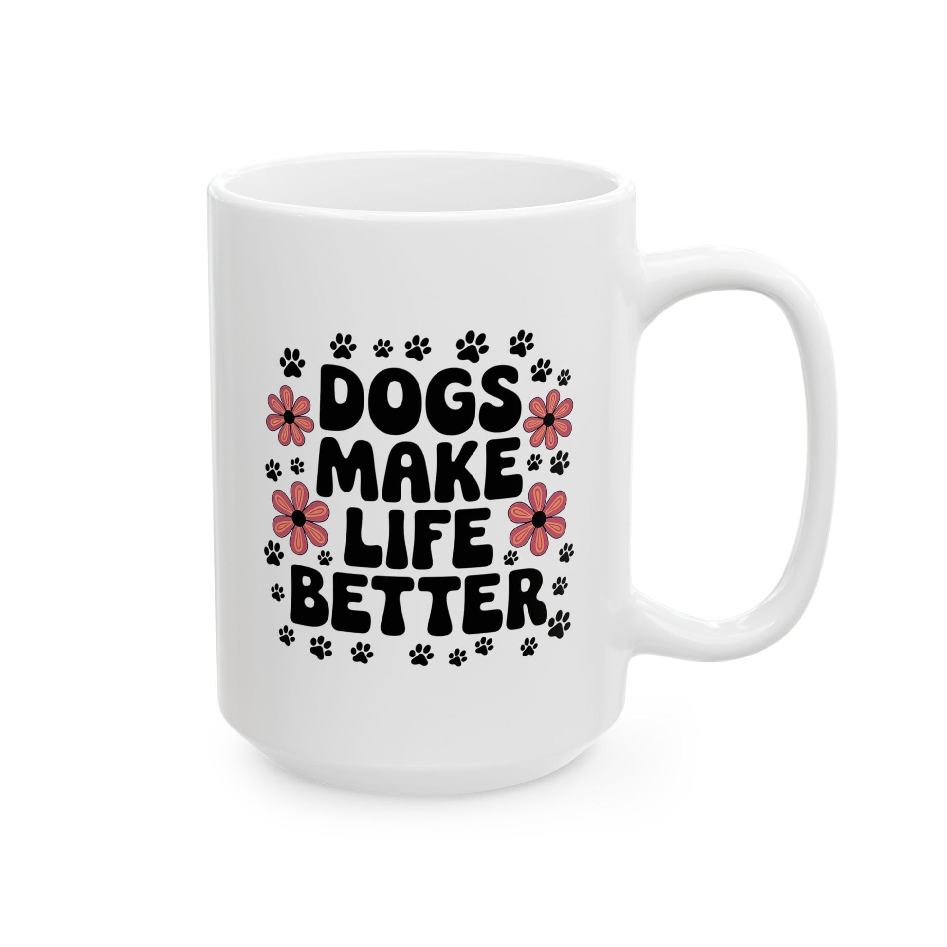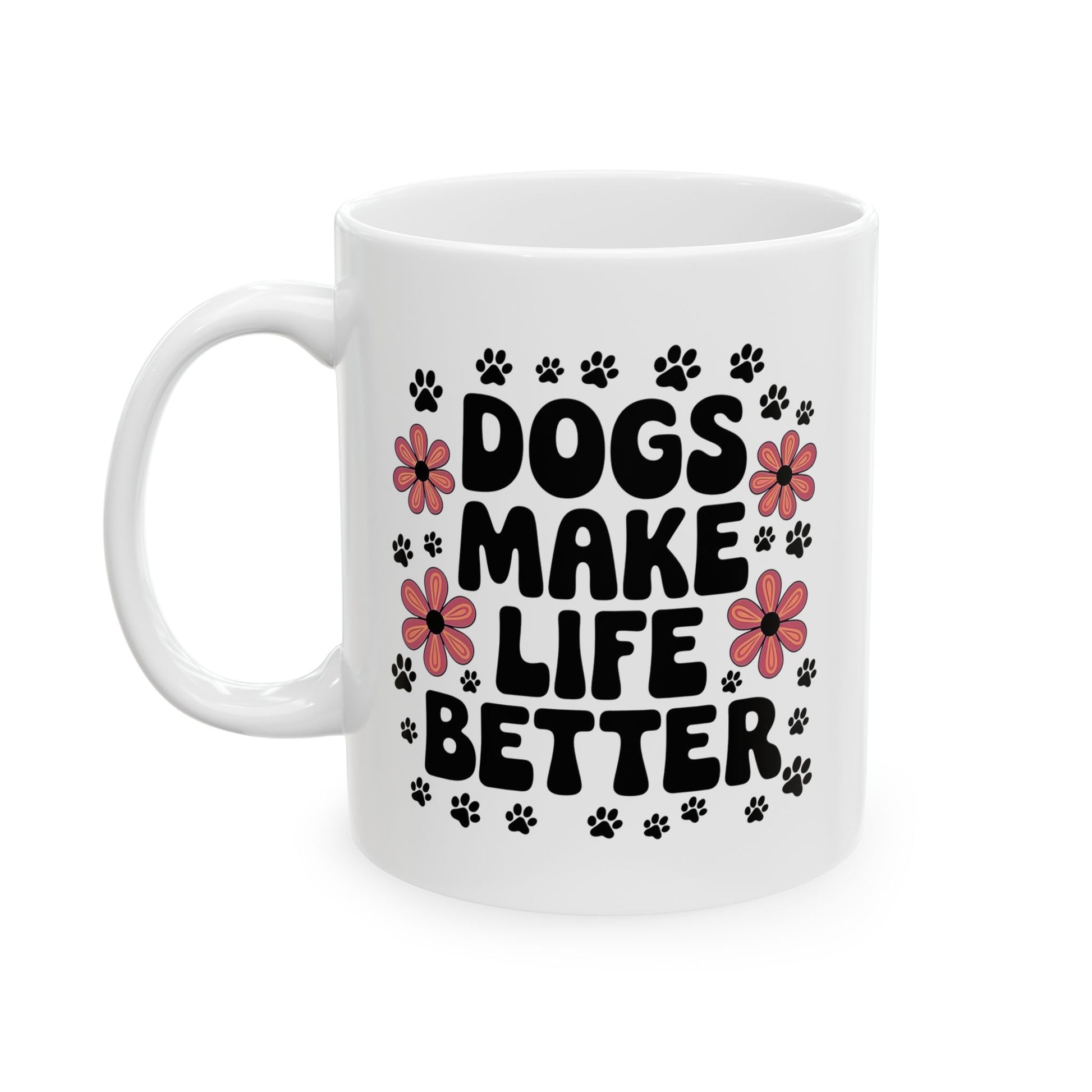 Celebrate the joy dogs bring with the "Dogs Make Life Better" mug, beautifully adorned with floral accents. Perfect for dog lovers, this mug adds a warm, uplifting touch to your daily coffee or tea ritual. Its charming design reminds you of the comfort and happiness pets provide, making every sip a moment of gratitude and support. Ideal as a thoughtful gift or a personal treat, this mug blends style and sentiment to brighten your day.