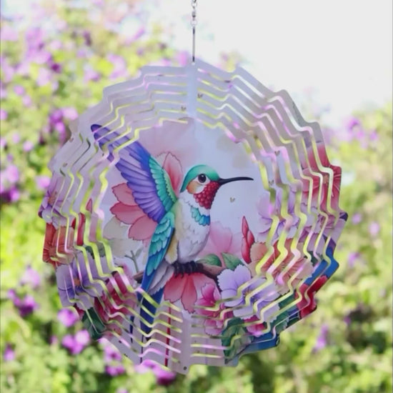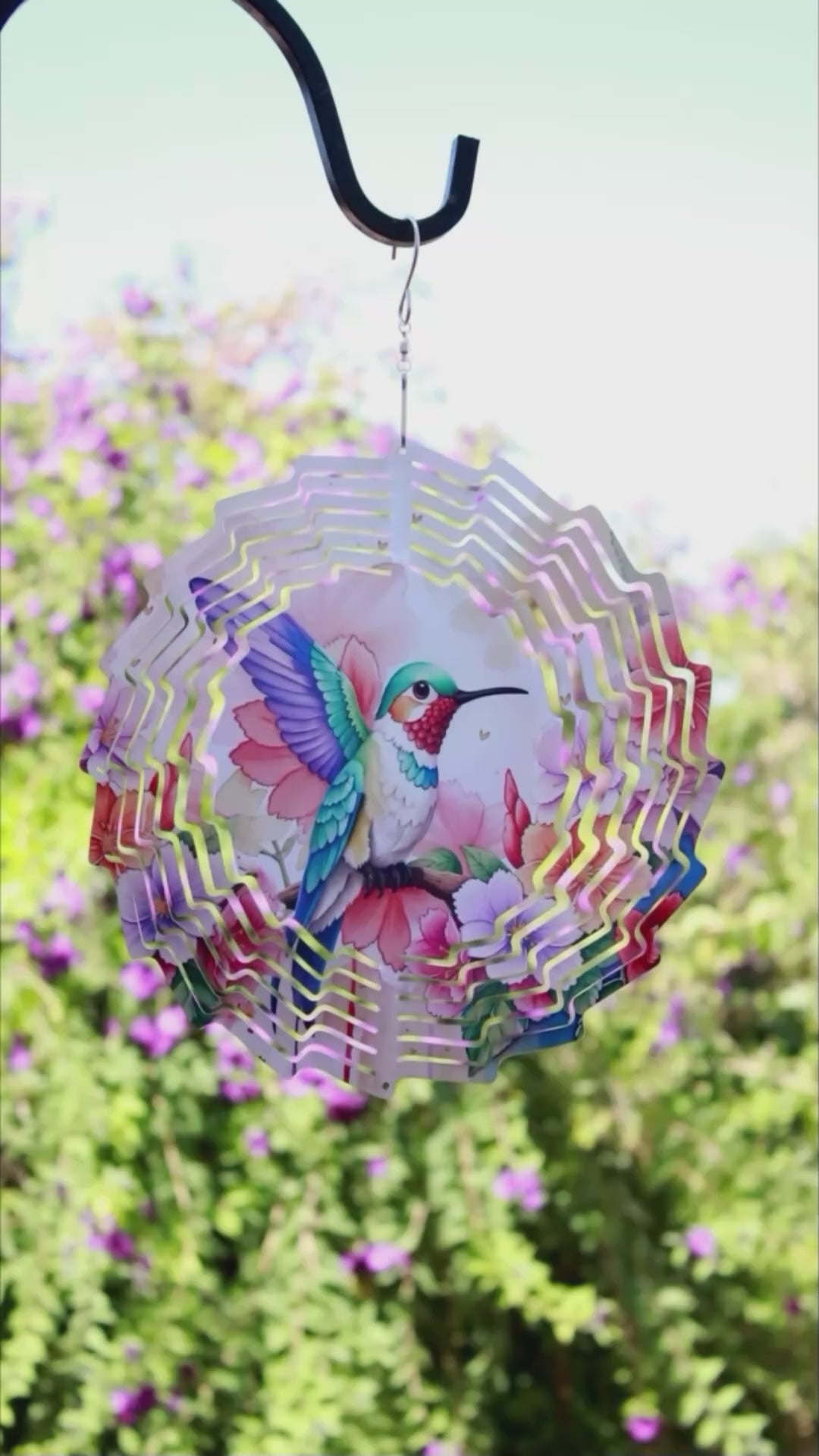 Add a touch of whimsical magic to your garden with this 10" circular wind spinner featuring a colorful hummingbird design on both sides.