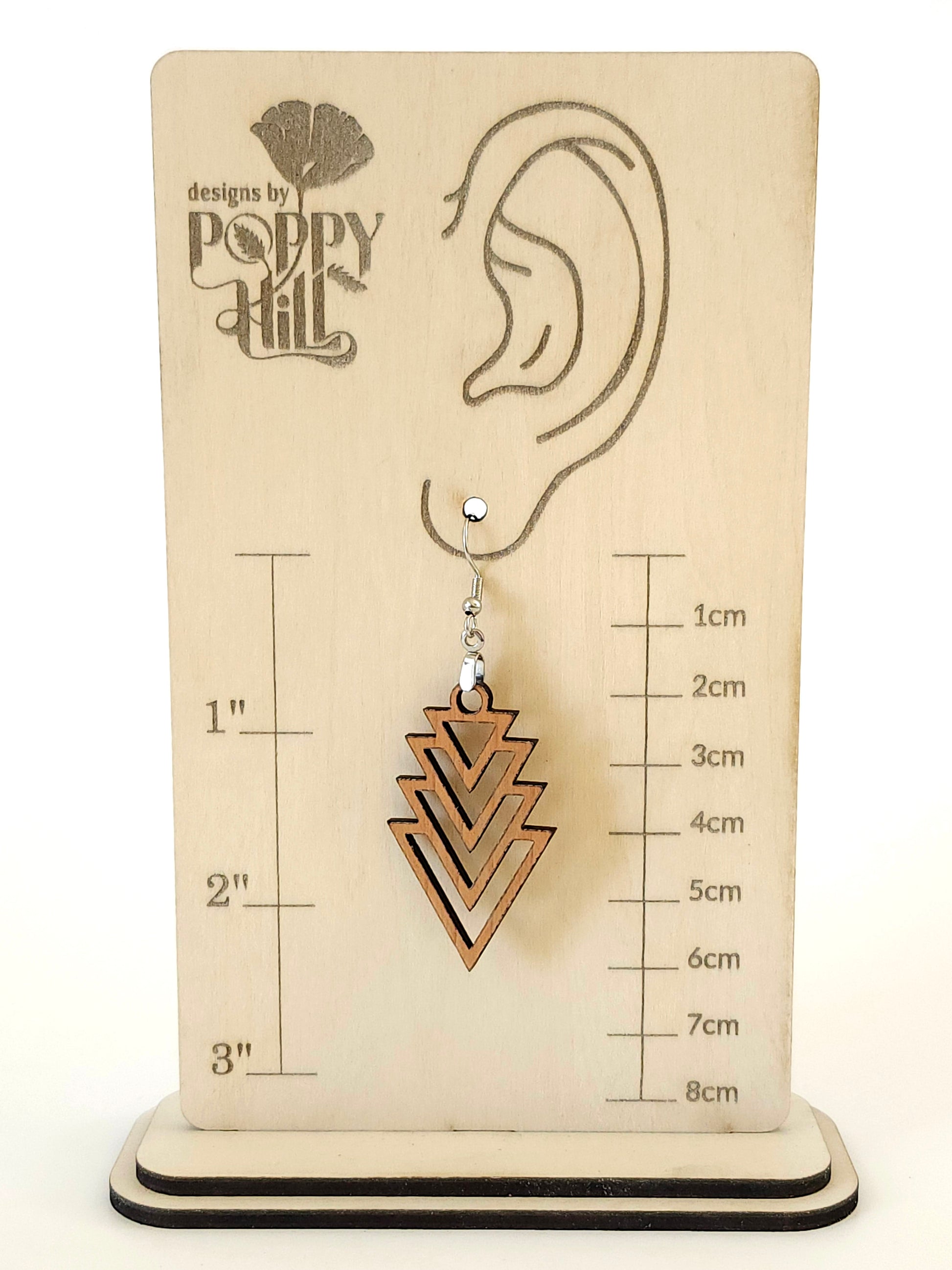 Elevate your style with these stacked triangle earrings. Multiple triangles in various sizes stacked together to create a unique abstract design. Laser cut from dark wood. Lightweight yet durable, they add a touch of bohemian sophistication to any outfit.