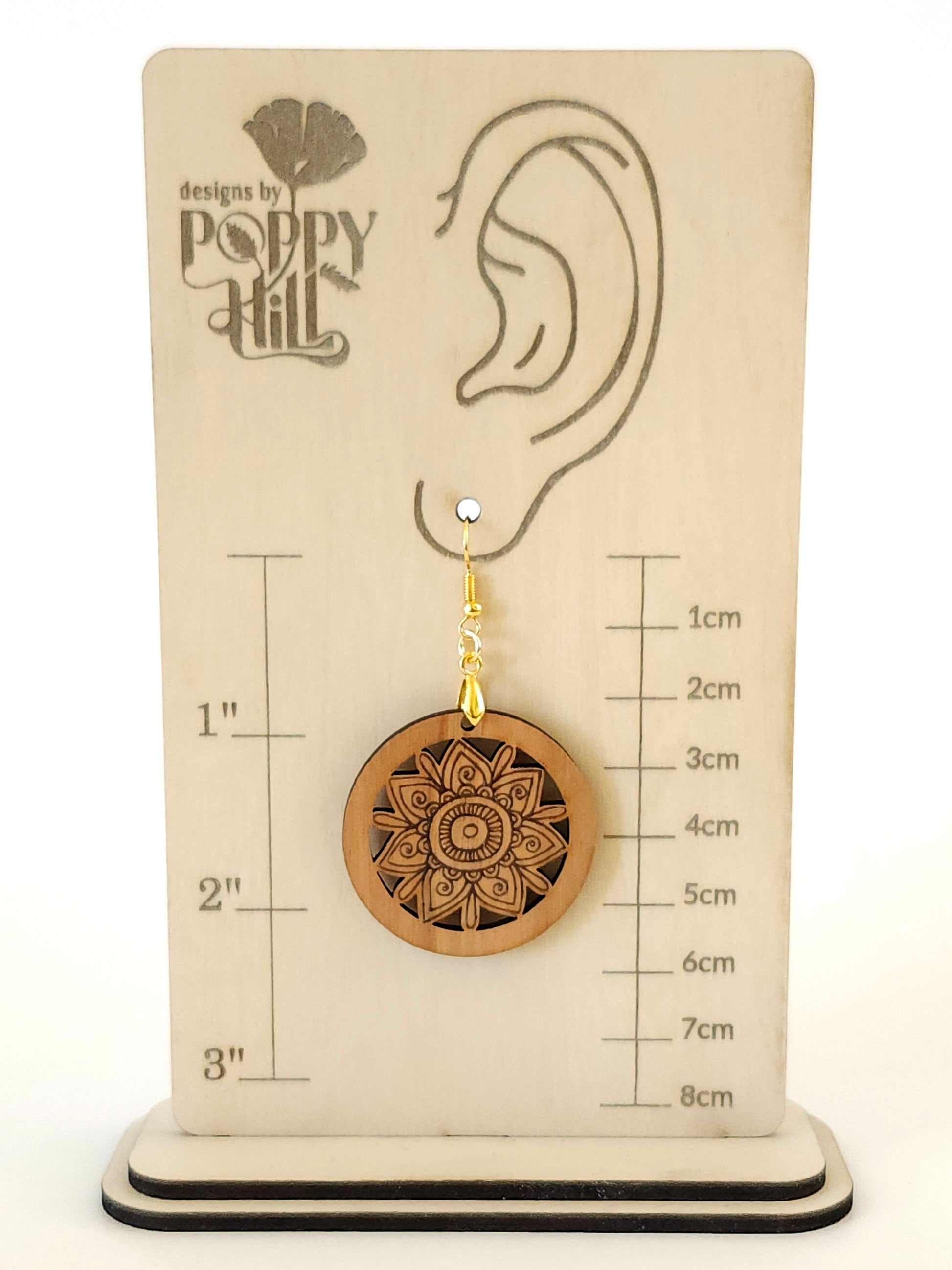 Laser cut from dark wood, these circular earrings showcase an intricate tribal design. The beautiful contrast between the engraved pattern and the rich wood tone creates a striking accessory that celebrates artisanal craftsmanship while adding a touch of cultural elegance to any outfit. Lightweight and comfortable for all-day wear.